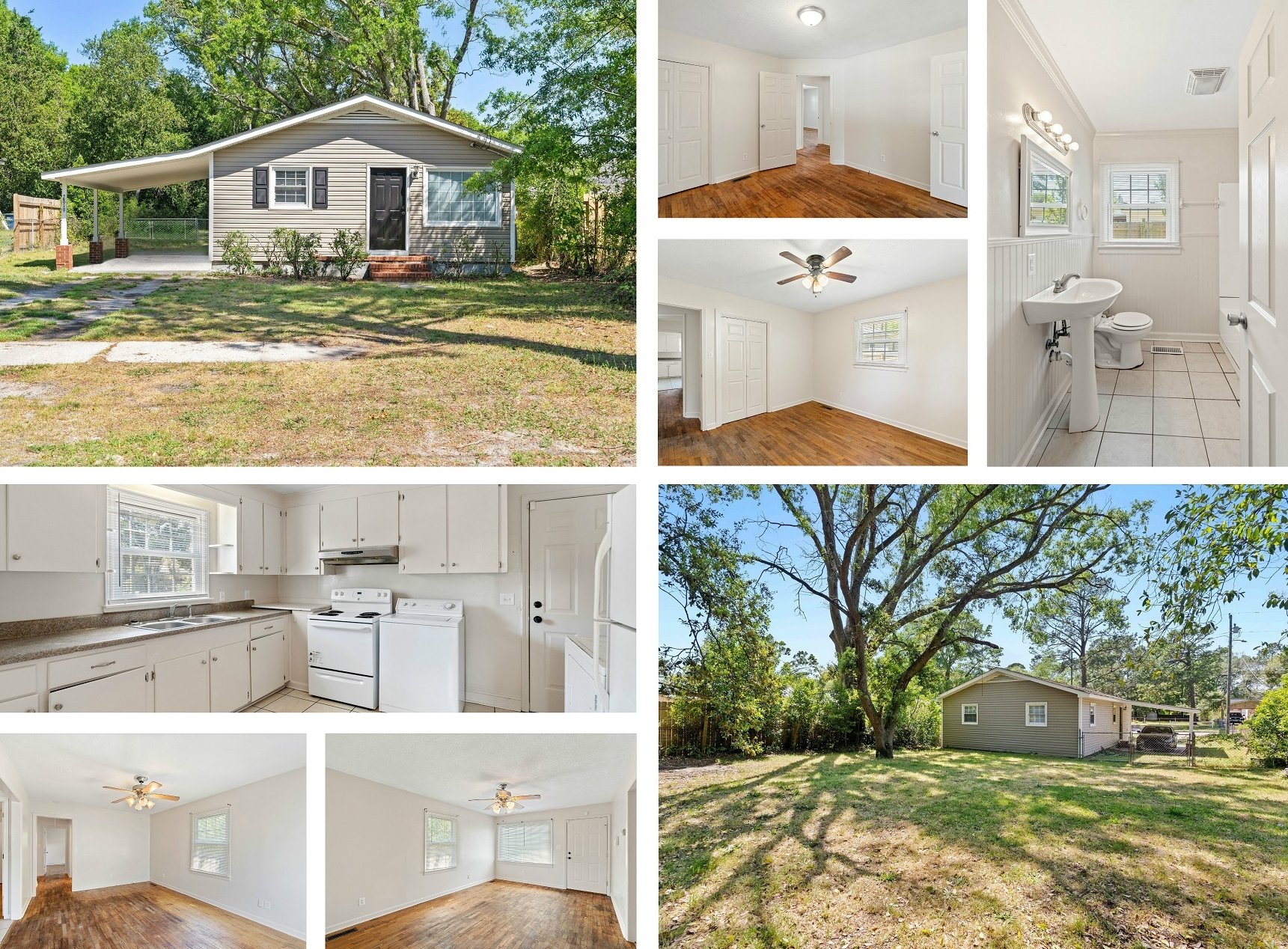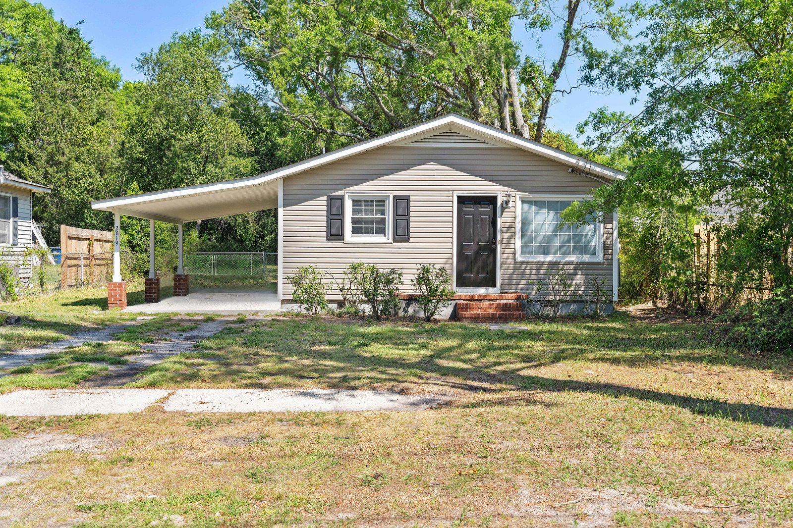 Home has hardwood and tile flooring, lots of windows, ample closet storage, and pull-down attic access. Exterior features include a front stoop with brick detail, attached carport.
