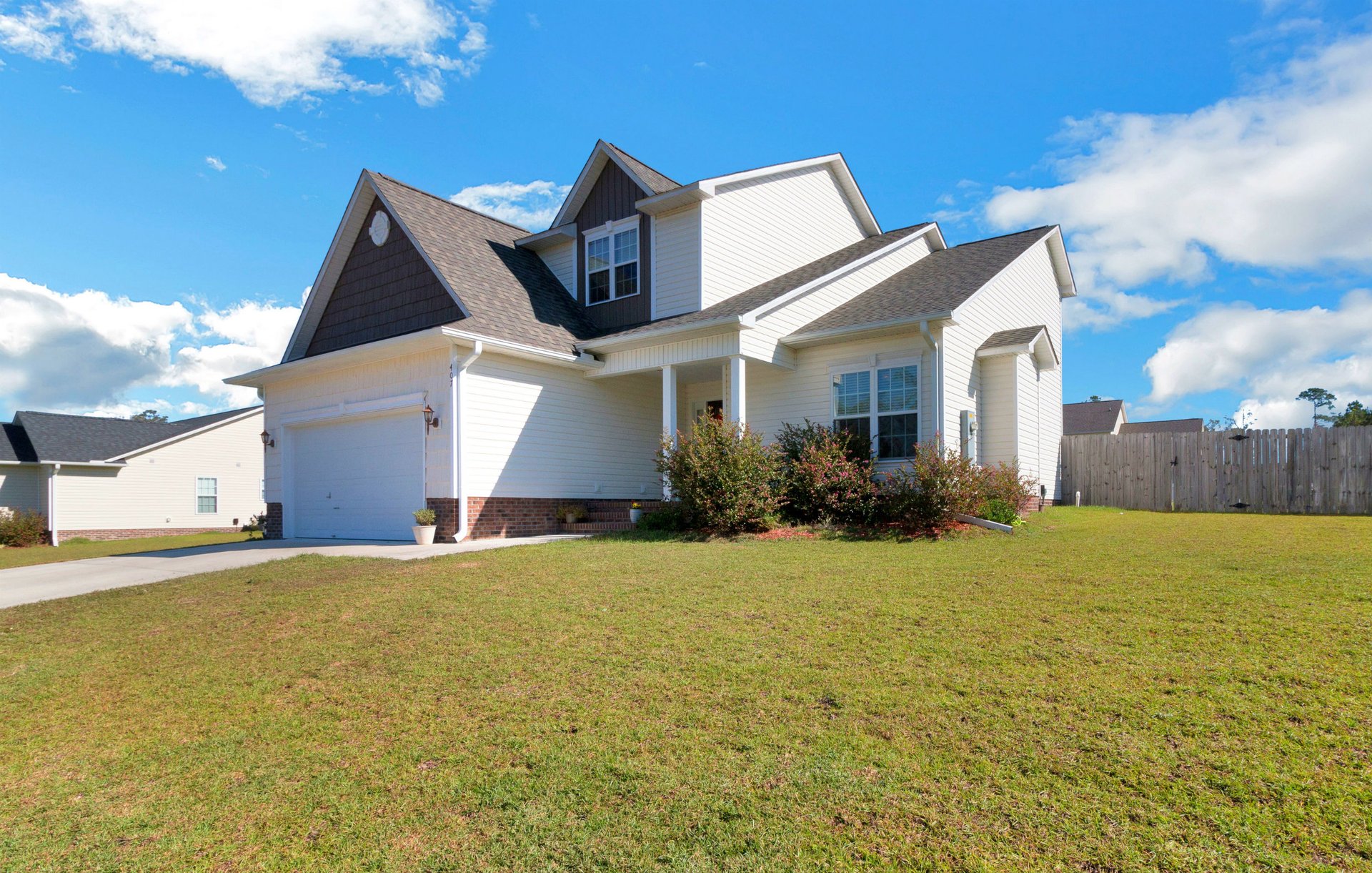 Exterior features include vinyl siding with brick accents, a covered front entry, an attached garage, and a paved driveway.
